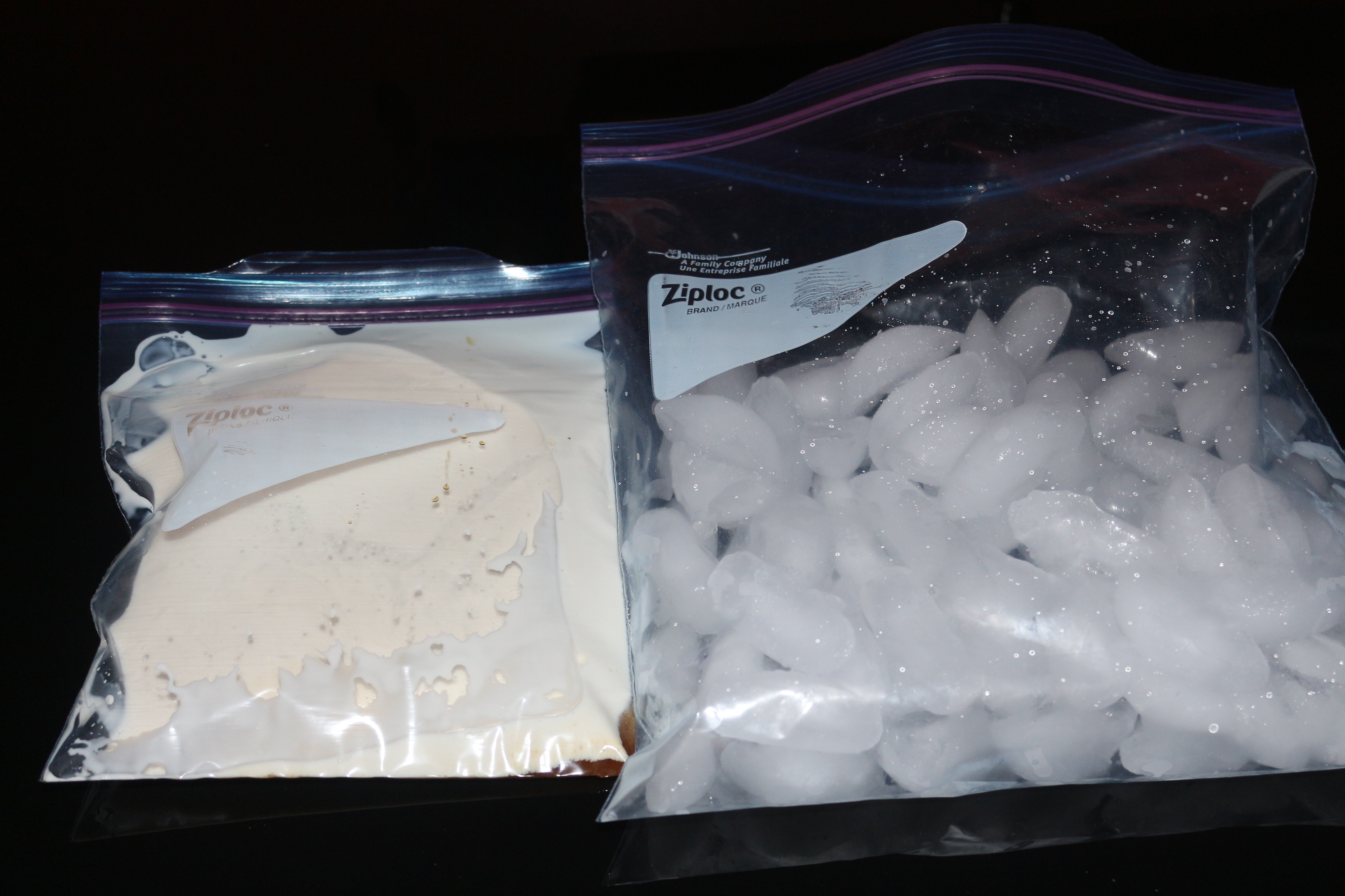 - Put the ice and salt in the large bag.
